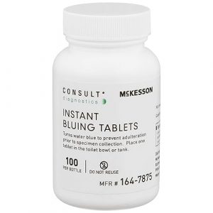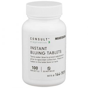 - McKesson Consult instant bluing tablets work to turn toilet water blue; specifically for urine and drug testing