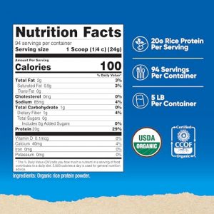- Includes 5 LB of rice protein powder (from organic brown rice) for your protein needs.